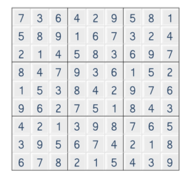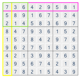 같은 줄에 1 에서 9 까지의 숫자를 한번씩만 넣고, 3 x 3 크기의 작은 격자 또한, 1 에서 9 까지의 숫자가 겹치지 않아야 한다.