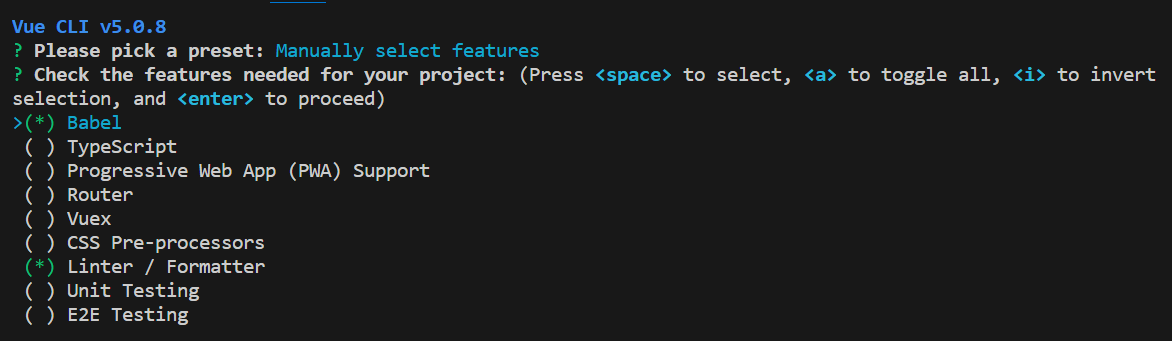 default를 선택할 시 babel과 eslint가 자동으로 설치가 된다.