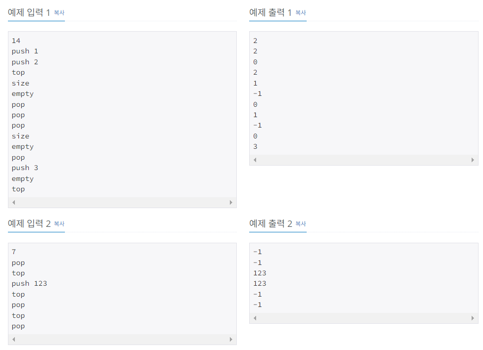 - empty: 스택이 비어있으면 1, 아니면 0을 출력한다.