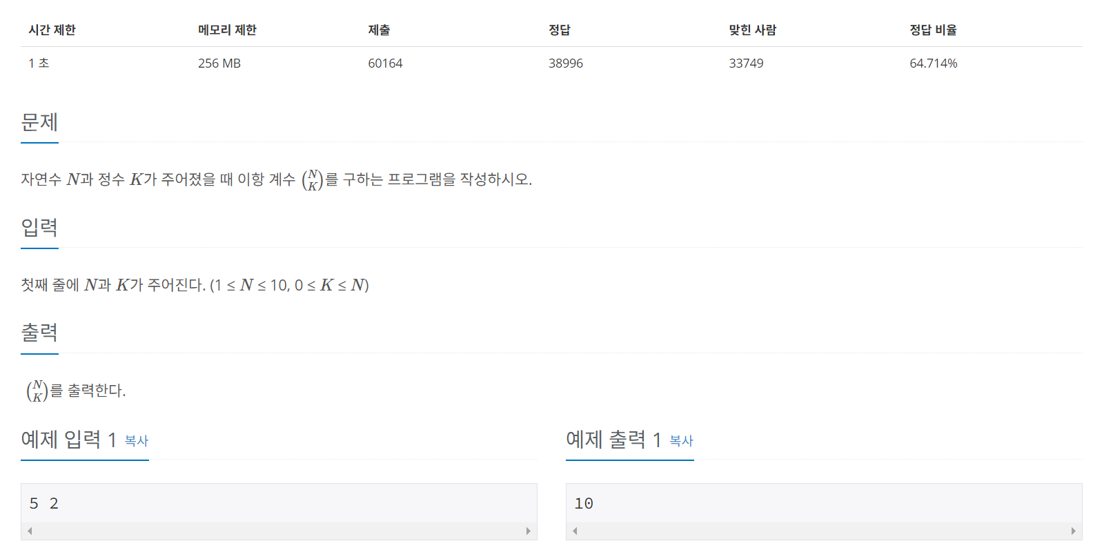 www.acmicpc.net/problem/11050 11050번: 이항 계수 1 첫째 줄에 \(N\)과 \(K\)가 주어진다. (1 ≤ \(N\) ≤ 10, 0 ≤ \(K\) ≤ \(N\)) www.acmicpc.net 문제 알고리즘 [접근 방법] 이항 계수(Binomial coefficient) 문제 자체는 매