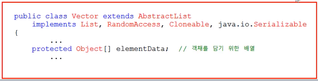 Vector를 자세히 살펴보면 객체 배열이 있다. Object(객체) 배열에는 모든 종류의 객체를 저장할 수 있음