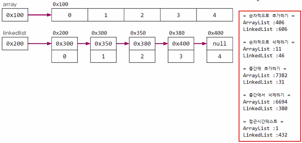 ③ 접근시간(access time) - ArrayList가 빠름