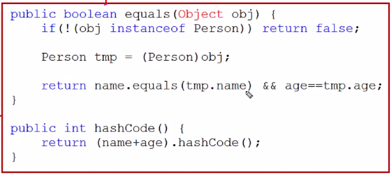 - Person이라는 class가 있을 때 Person객체를 호출한다고 하면 equals()와 hashCode()를 호출해야 하는 것임. 그런데 이 두 메소드는 Object 클래스에 있다. 그리고 생략이 되어 있지만 Object의 상속을 받고 있다. 그래서 문제가 없다. 하지만 이 두 메소드가 오버라이딩 되어 있지 않으면 문제가 생긴다.