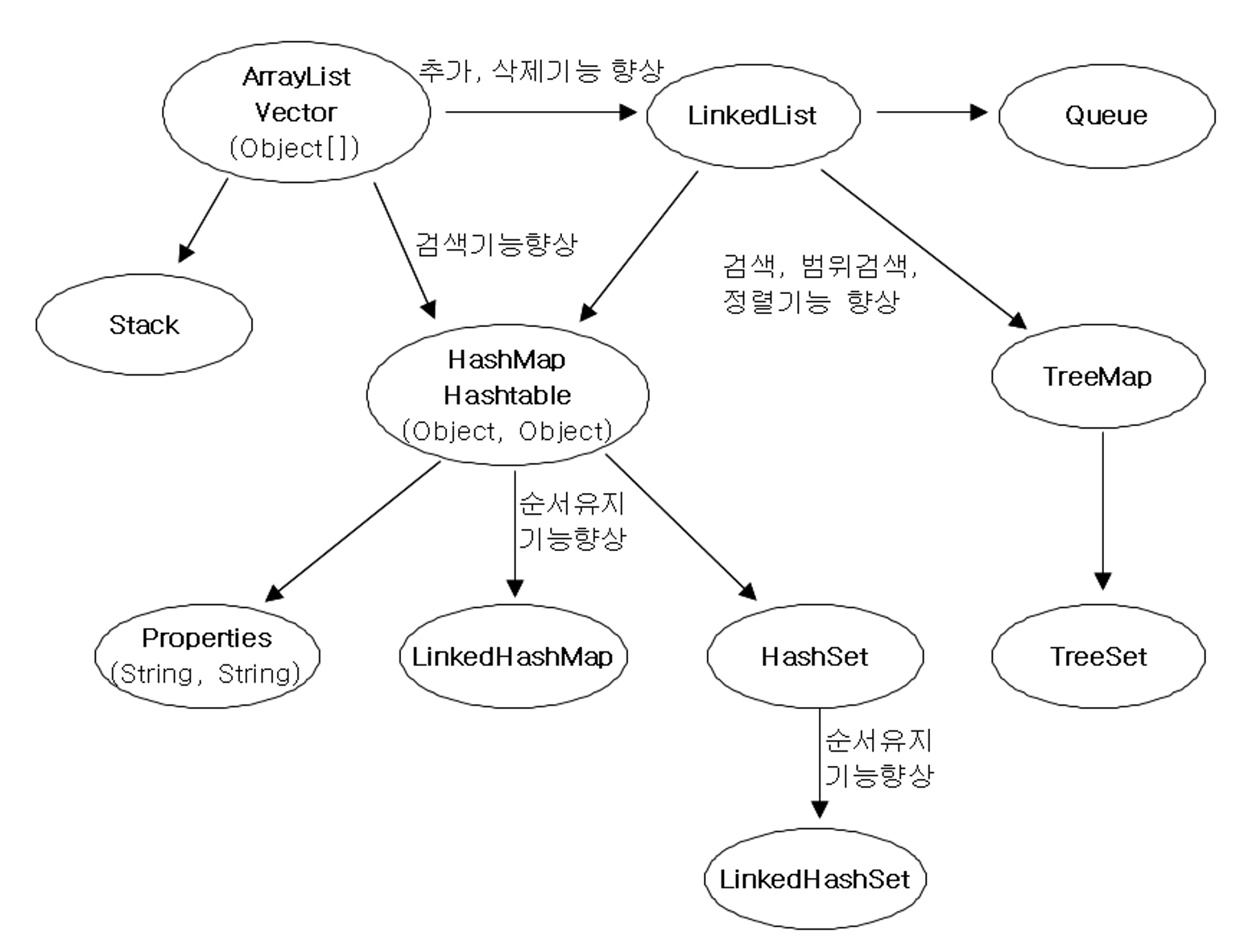 | HashMap | 배열과 연결이 결합된 형태. 추가, 삭제, 검색, 접근성이 모두 뛰어남. 검색에는 최고성능을 보인다. |
