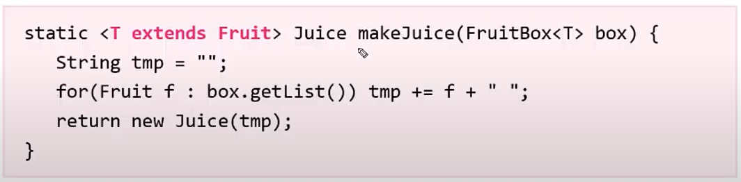 System.out.println(Juicer.<Fruit>makeJuice(fruitBox)); //OK