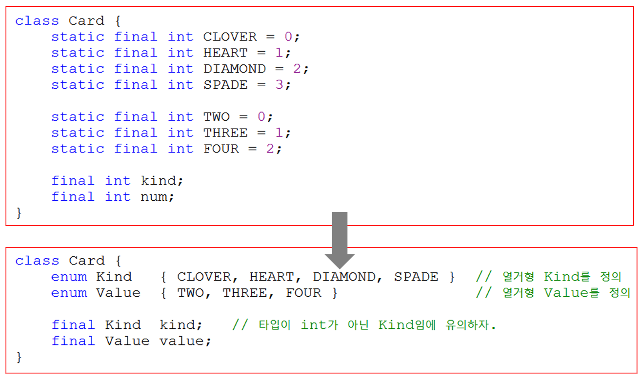 if(Card.CLOVER == Card.TWO) 라는 코드가 있다고 하자. true이지만 false여야 의미상 맞다.