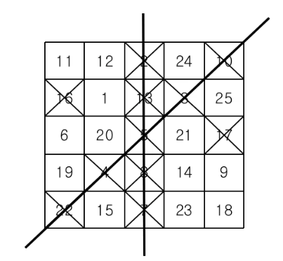 먼저 아래와 같이 25개의 칸으로 이루어진 빙고판에 1부터 25까지 자연수를 한 칸에 하나씩 쓴다