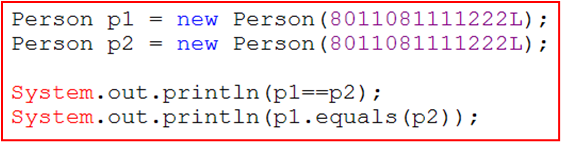 2. System.out.println(p1.equals(p2)); p1.equals(p2)는 오버라이딩했기 때문에 그에 따라서 id를 가지고 비교한다. this.id == ((Person)obj).id가 되고, 8011081111222L == 8011081111222L이 되고, true라는 결과를 반환한다.