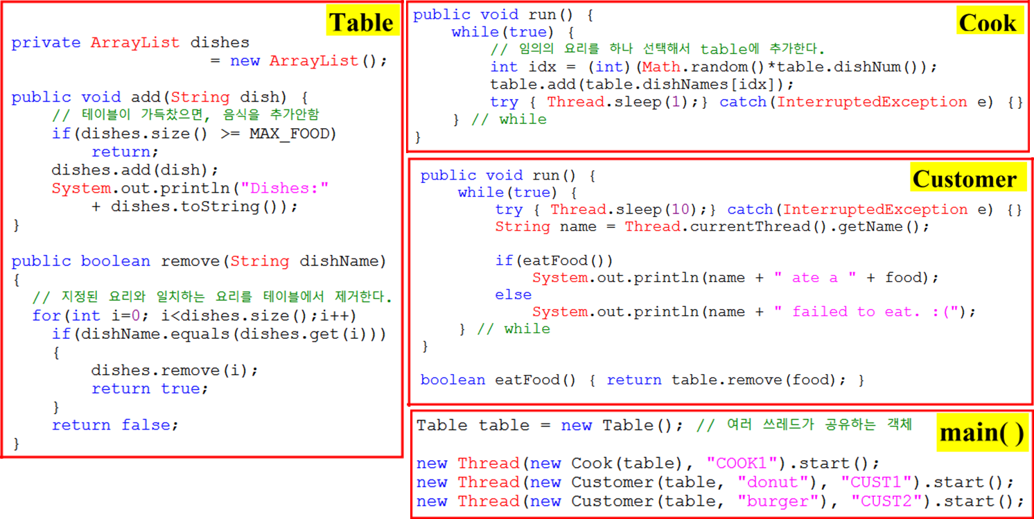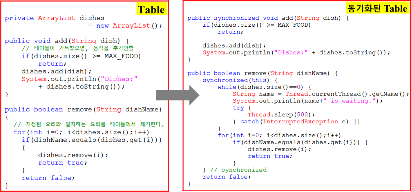 - 요리사와 손님이 같은 객체(Table)을 공유하므로 동기화가 필요