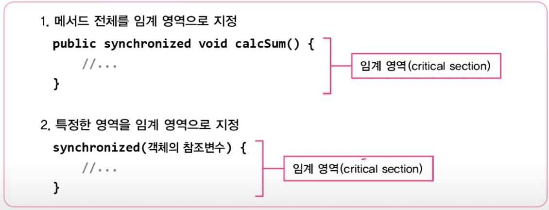 동기화를 하면 데이터가 보호는 되는데 한 번에 한 스레드만 임계영역에 들어갈 수 있다는 것은 동기화의 단점이다. 그래서 동기화를 하면 프로그램의 효율이 떨어진다.