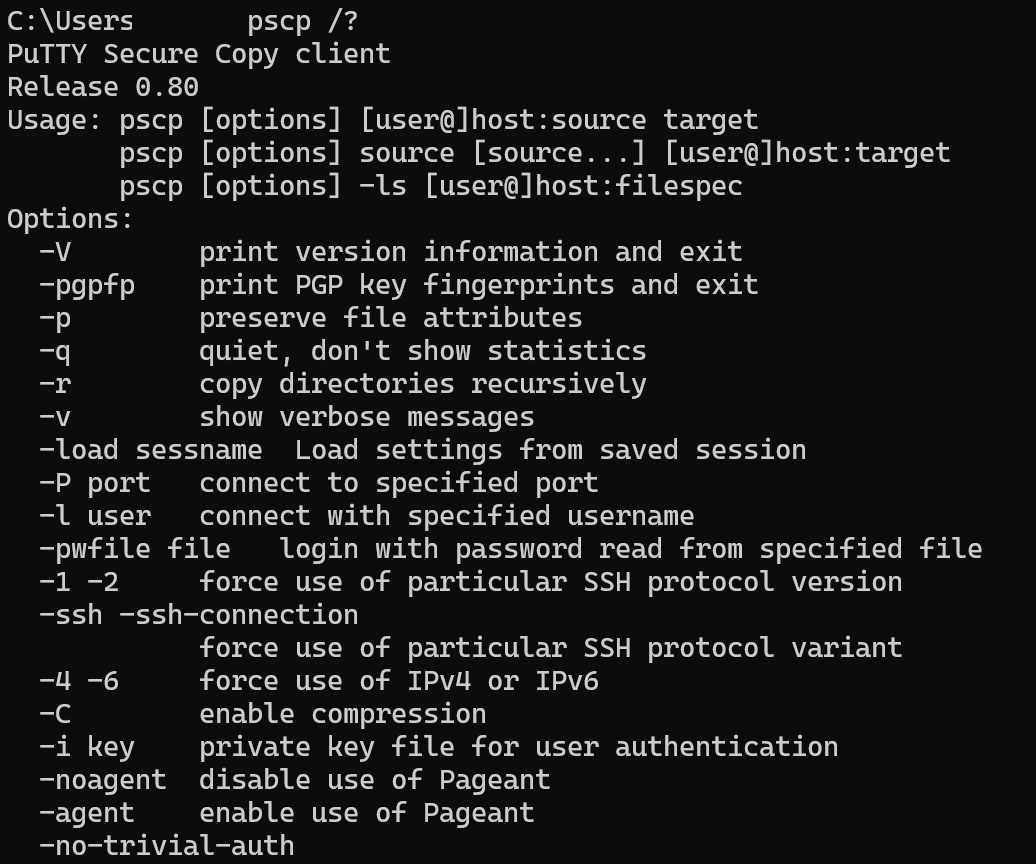 `pscp /?`를 쳐서 아래와 같은 이미지가 나오면 잘 되는 것이다.