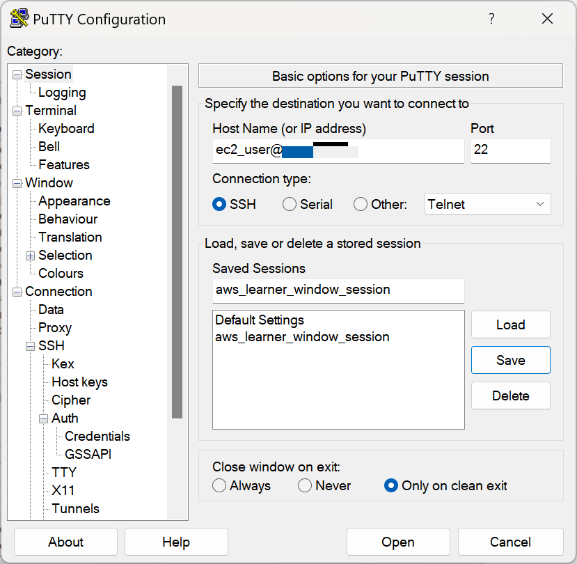 `Saved Sessions`에 이름 지어주고 `Save` 클릭