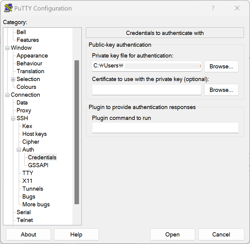 `Connection` - `SSH` - `Auth` - `Credentials`을 눌러서 들어간 뒤 private key file for authentication에 아까 전의 ppk 파일을 넣어준다.